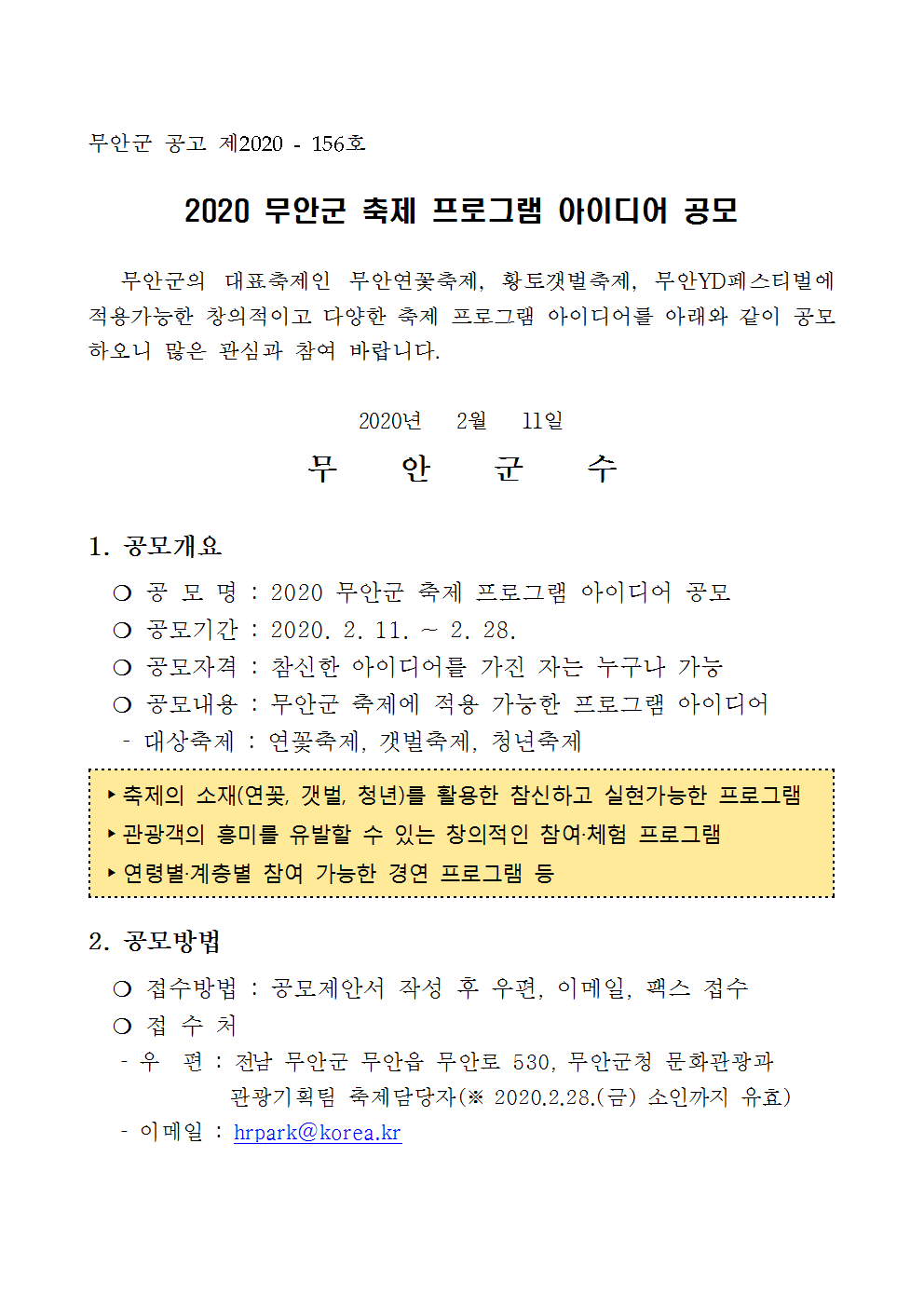 공고문(2020 무안군 축제 프로그램 아이디어 공모)001