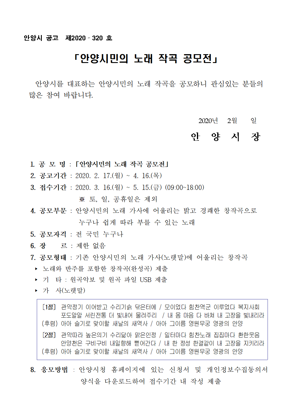 안양시민의 노래 작곡 공고문001