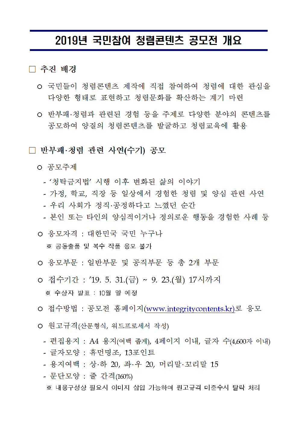 1. 2019년 국민참여 청렴콘텐츠 공모전 개요001