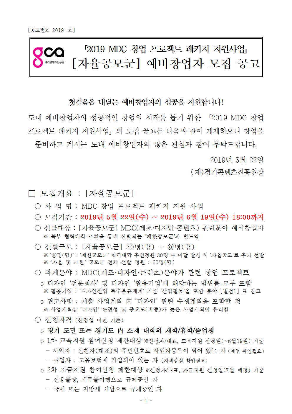 [공고문]2019 MDC 창업 프로젝트 패키지 자율군 모집 공고문001