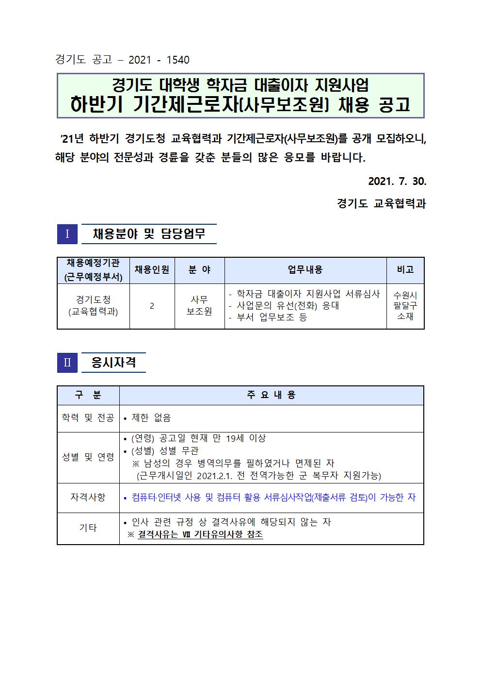 대학생 학자금 대출이자 지원사업 하반기 기간제근로자 채용 공고001