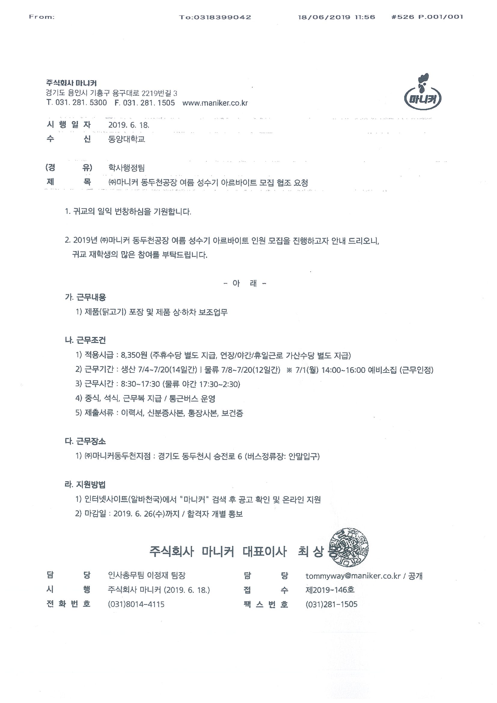 (주)마니커 동두천공장 여름 성수기 아르바이트 모집 안내 (20190619)