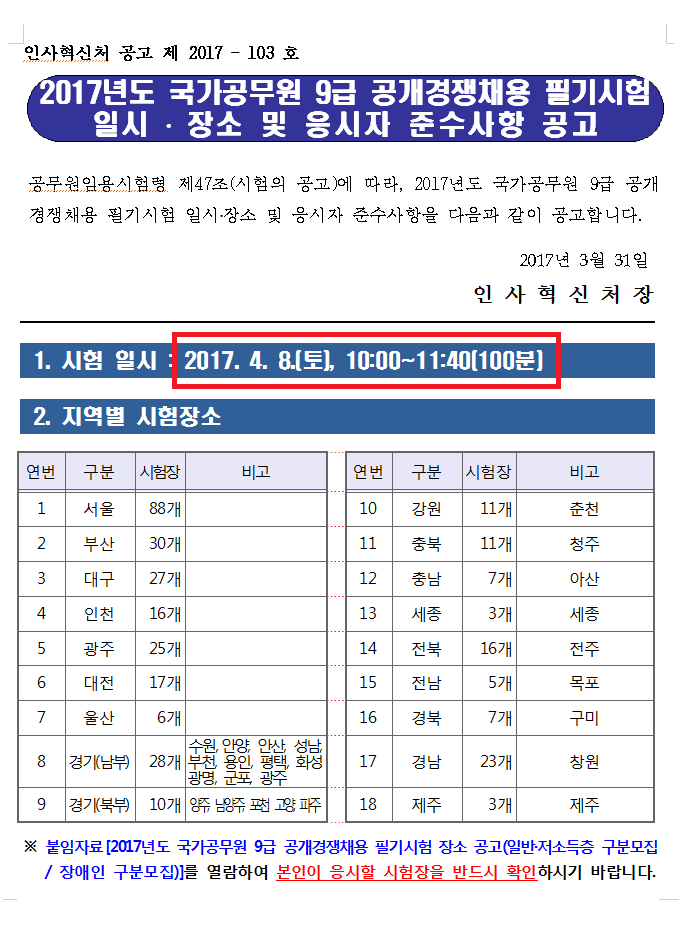 1. 시험장소 공고