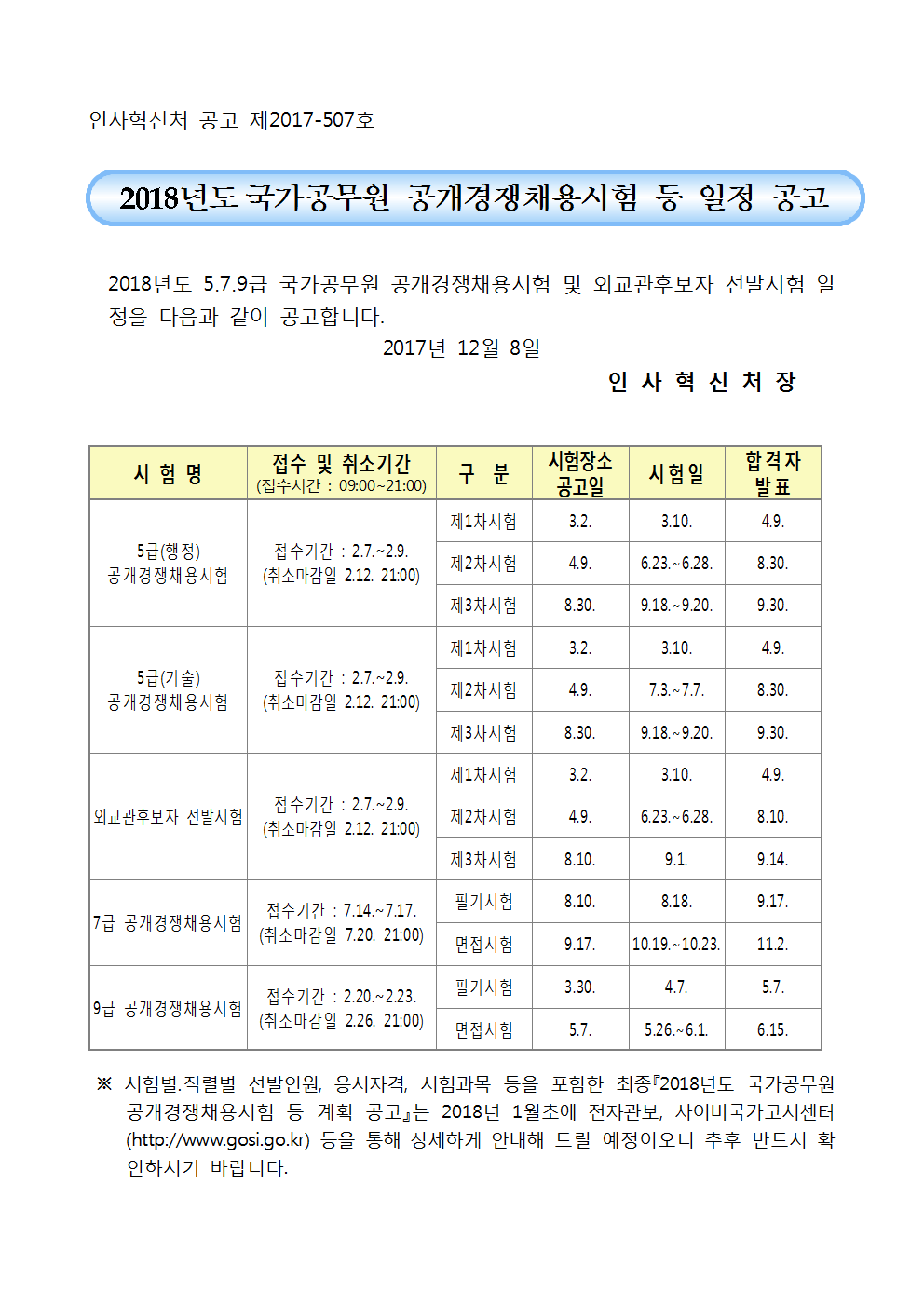 1. 2018년도 국가공무원 공개경쟁채용시험 등 일정 공고001