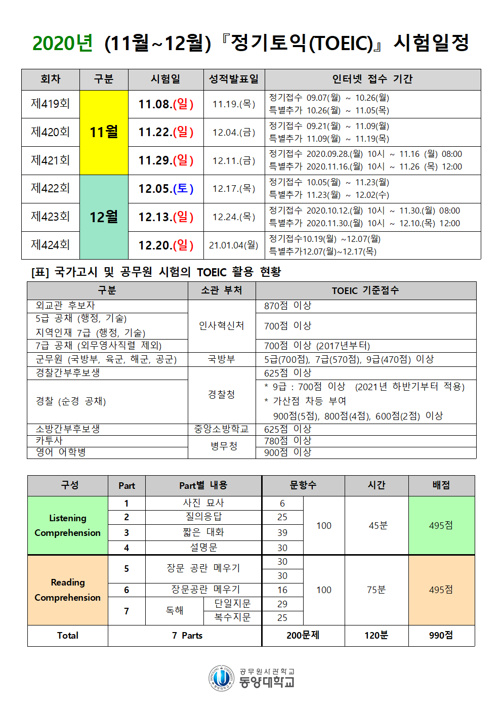 1. 2020년 정기토익(TOEIC) 시험일정 (11월~12월)