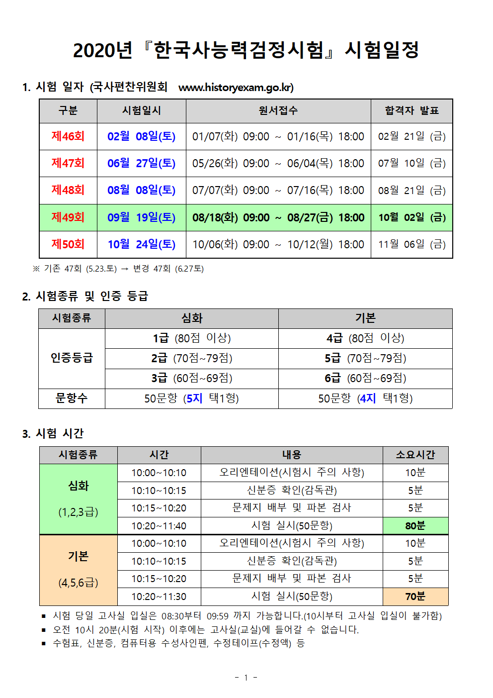 2. 2020년 한국사능력검정 시험일정 (9월 필기시험)001