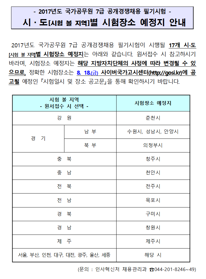 2017년도 국가공무원 7급 공채 필기시험 시도별 시험장소 예정지 안내