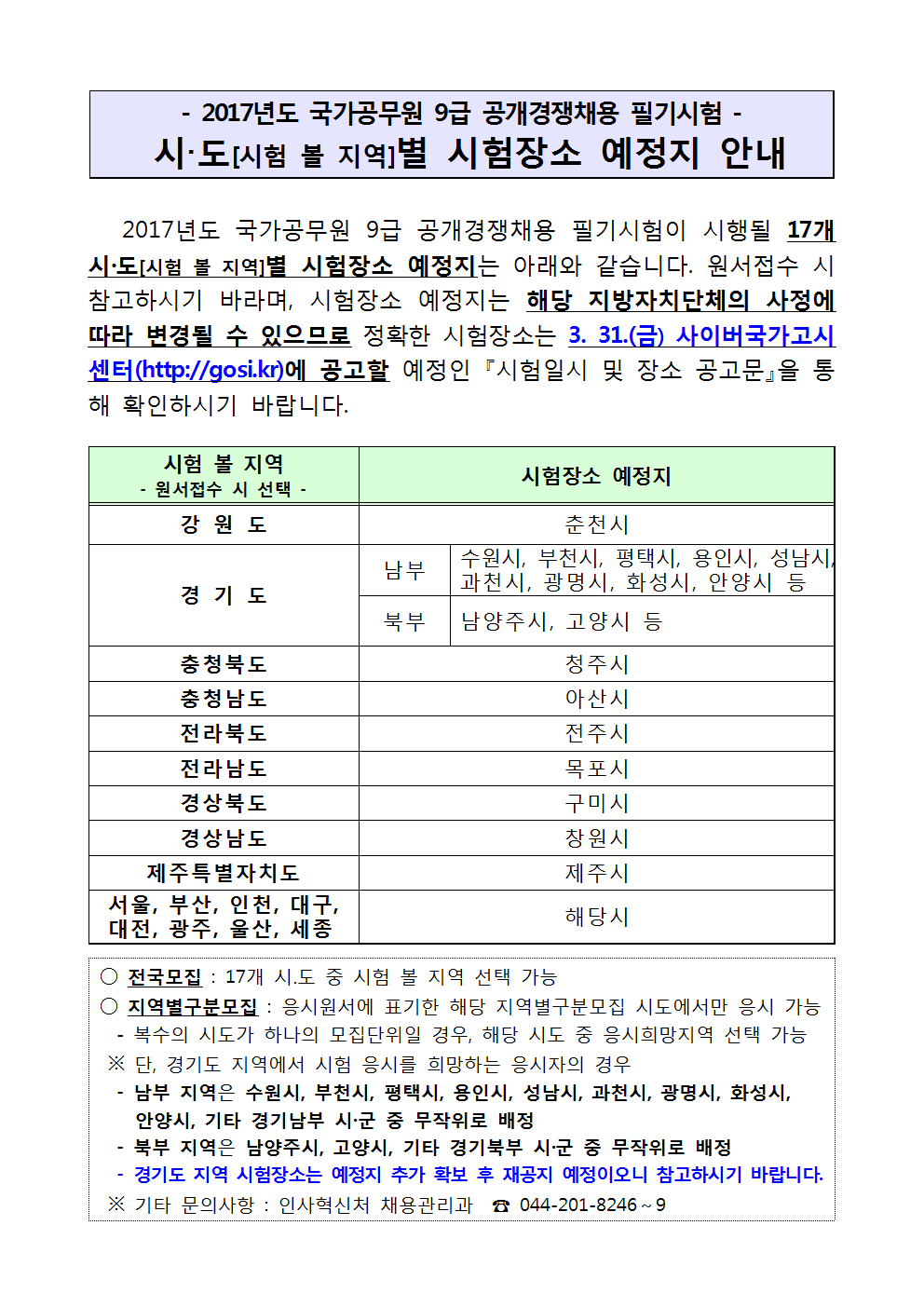 2017년도 국가공무원 9급 공채 필기시험 시도별 시험장소 예정지 안내