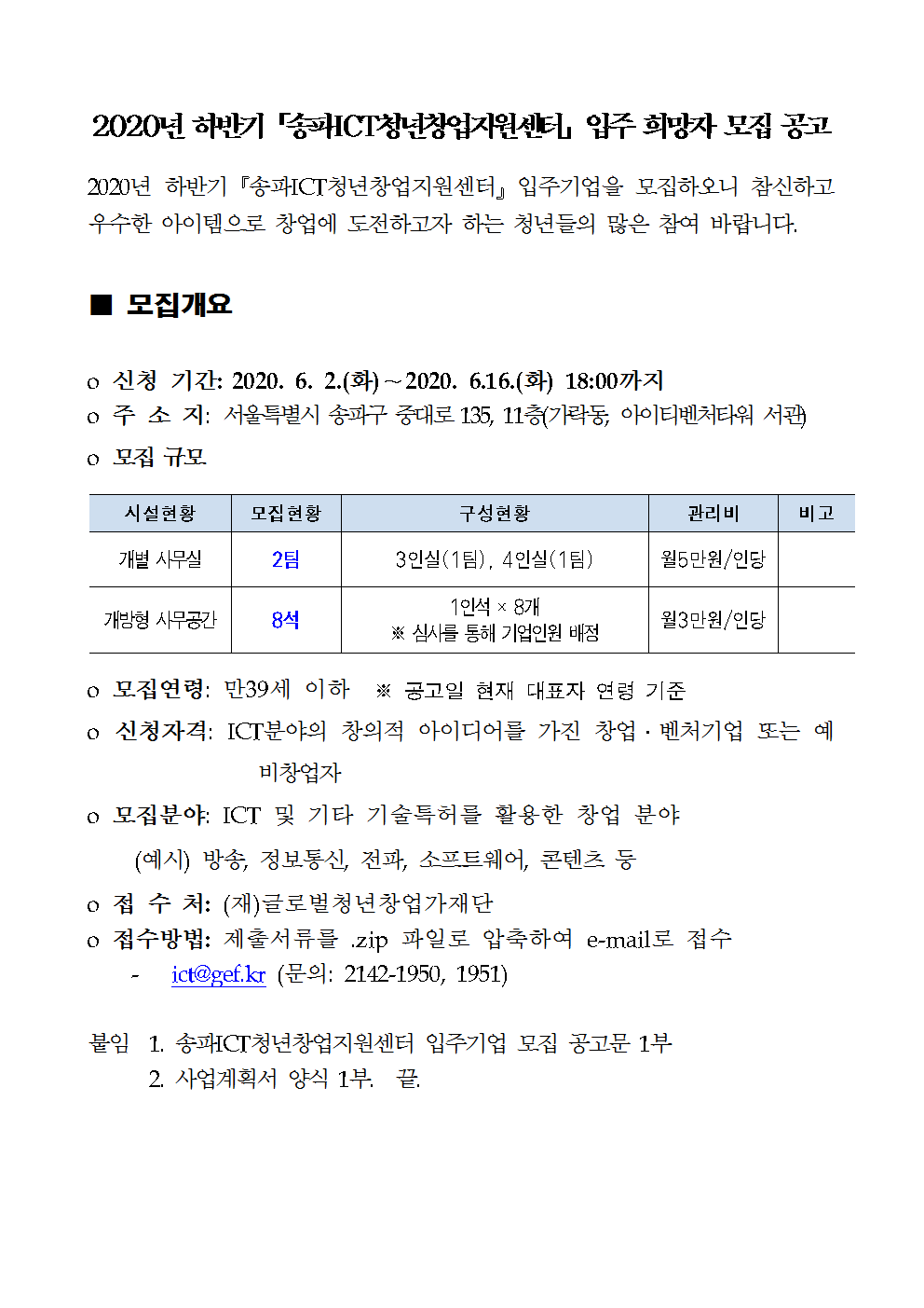 2020년 하반기「송파ICT청년창업지원센터」입주 희망자 모집 공고001
