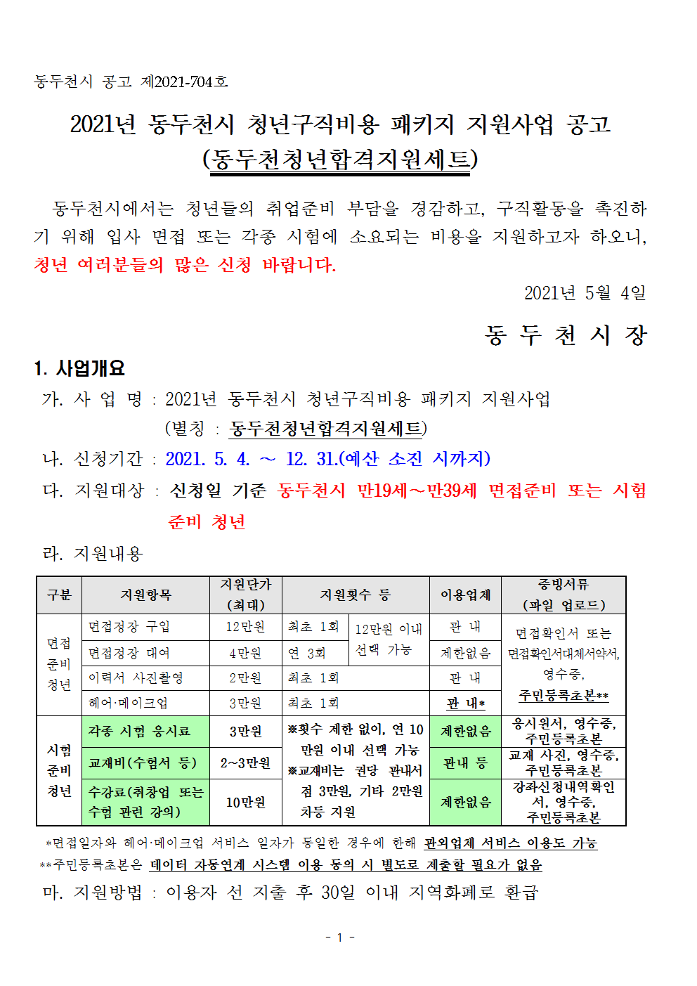 2021년 동두천시 청년구직비용 패키지 지원 사업 공고문 및 면접확인서001