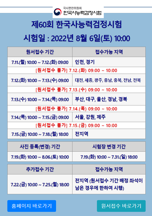 22′ 한국사능력검정(60회, 8.6.토) 접수중(7.11~7.18)
