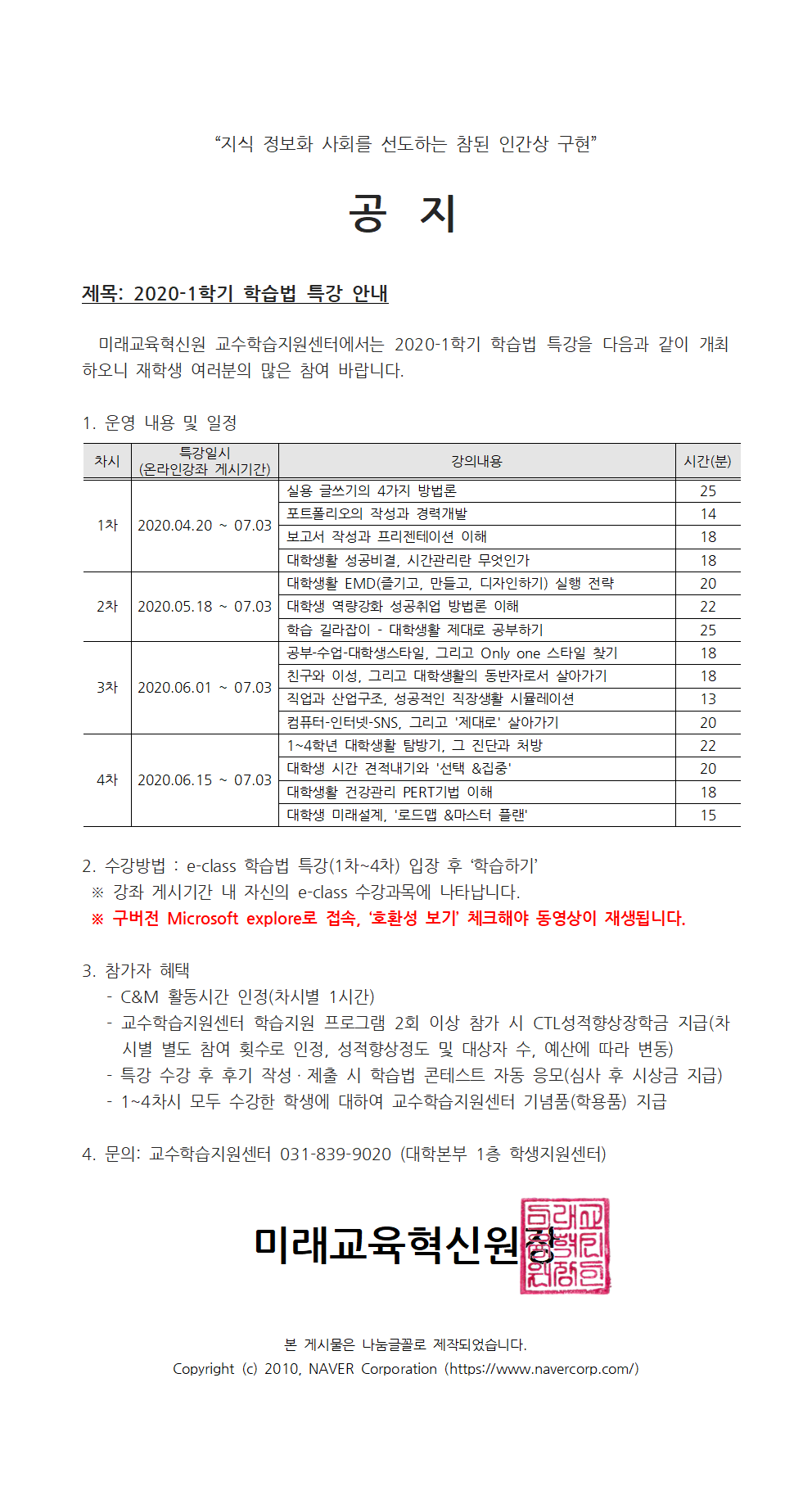 동두천 (홈페이지 공지문) 2020-1학기 학습법 특강 안내