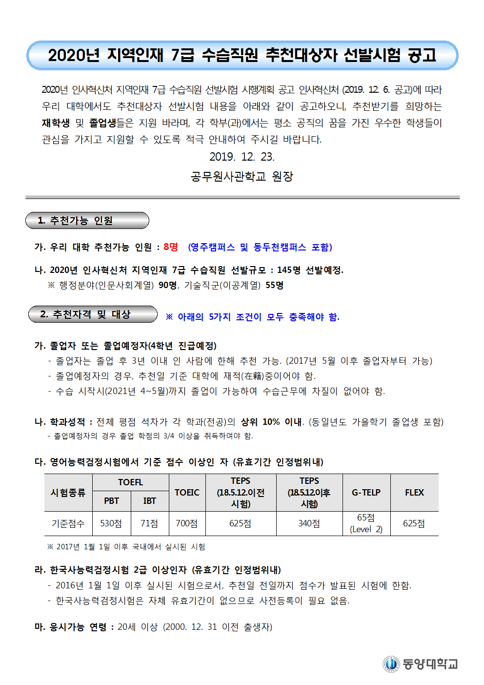 (동양대 공고문) 2020년도 지역인재 7급 수습직원 추천대상자 선발시험 공고001