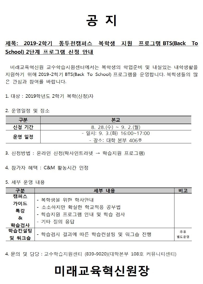 2019-2학기 복학생 지원프로그램(BTS) 2단계 신청안내