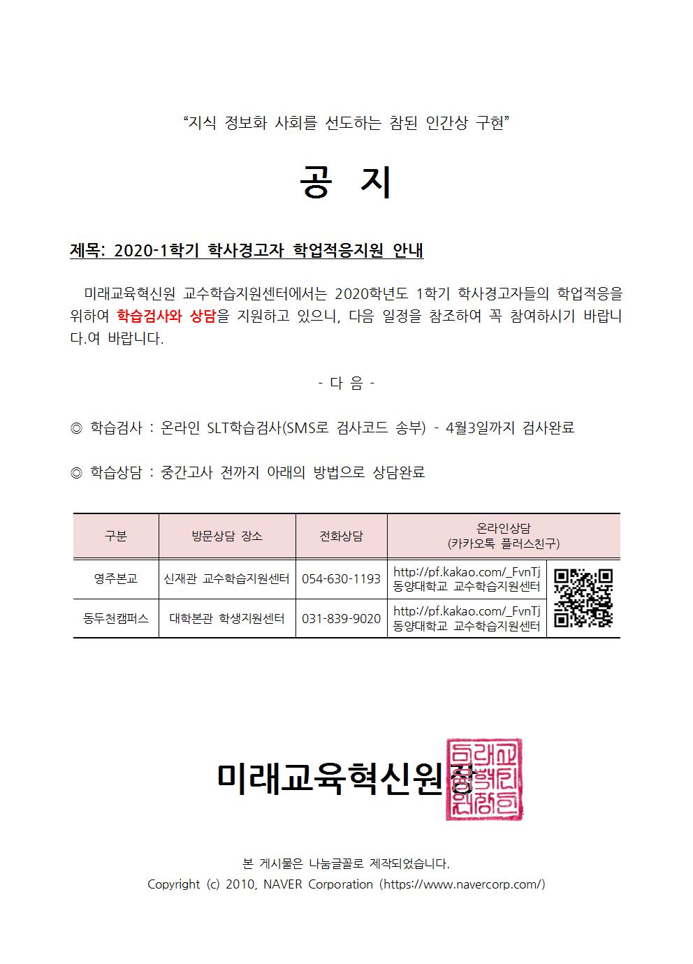 2020-1학기 학사경고자 학업적응지원 안내
