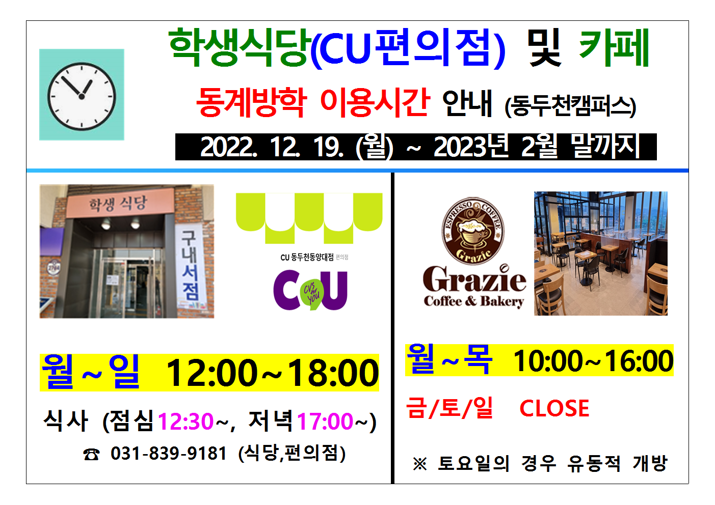 ★ 동두천캠퍼스 학생식당(CU편의점), 그라찌에카페 이용시간 안내 (2022-동계방학중)