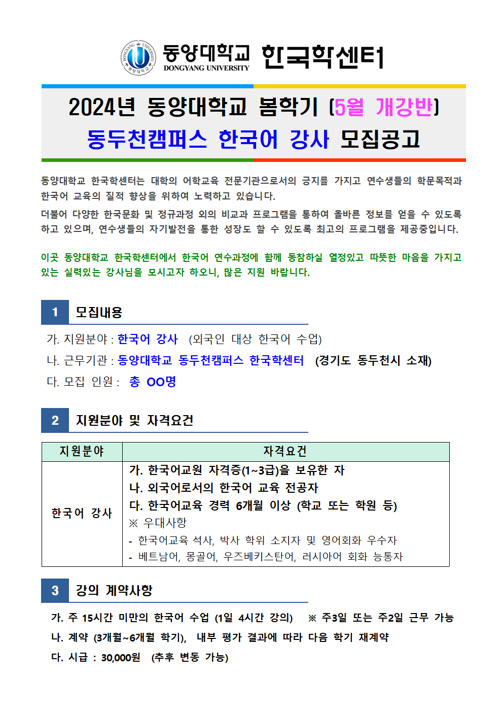 (공고문) 1. 2024년 동양대학교 5월 개강반 한국어 강사 모집공고 (동두천캠퍼스 한국학센터)001