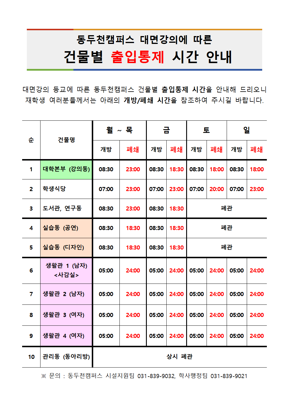동두천캠퍼스 대면강의에 따른 건물별 출입통제 시간 안내001