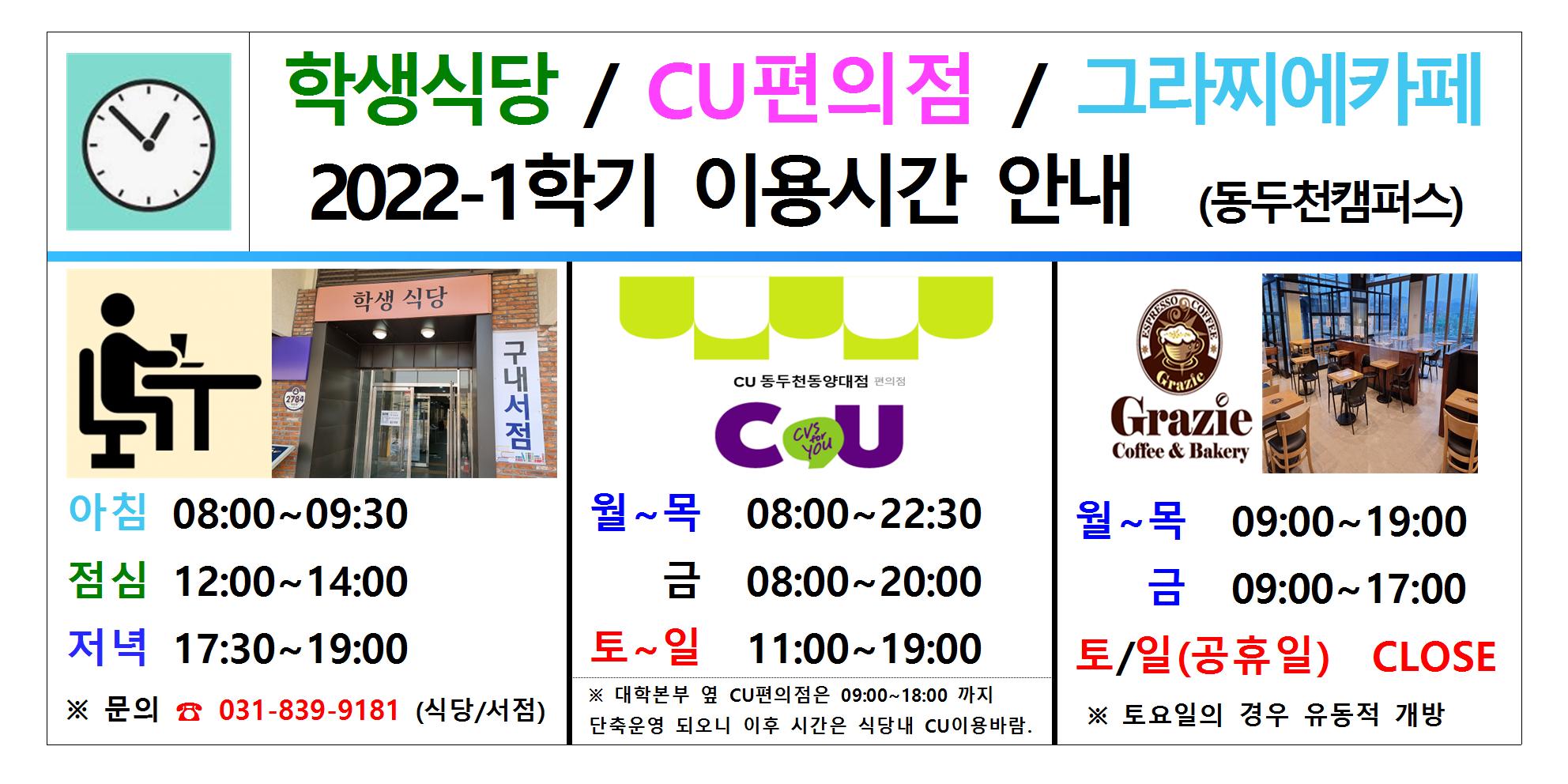동두천캠퍼스 학생식당, CU편의점, 그라찌에카페 이용시간 안내 (2022-1학기)001