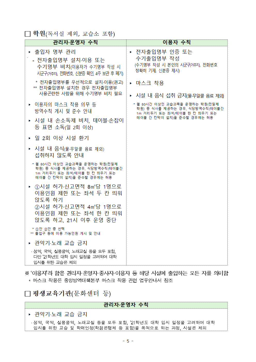 (붙임3) 수도권 일반관리시설 방역지침 추가 의무화 조치005