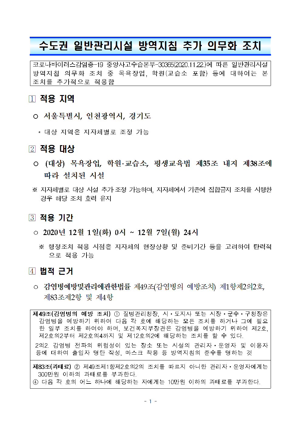 (붙임3) 수도권 일반관리시설 방역지침 추가 의무화 조치001