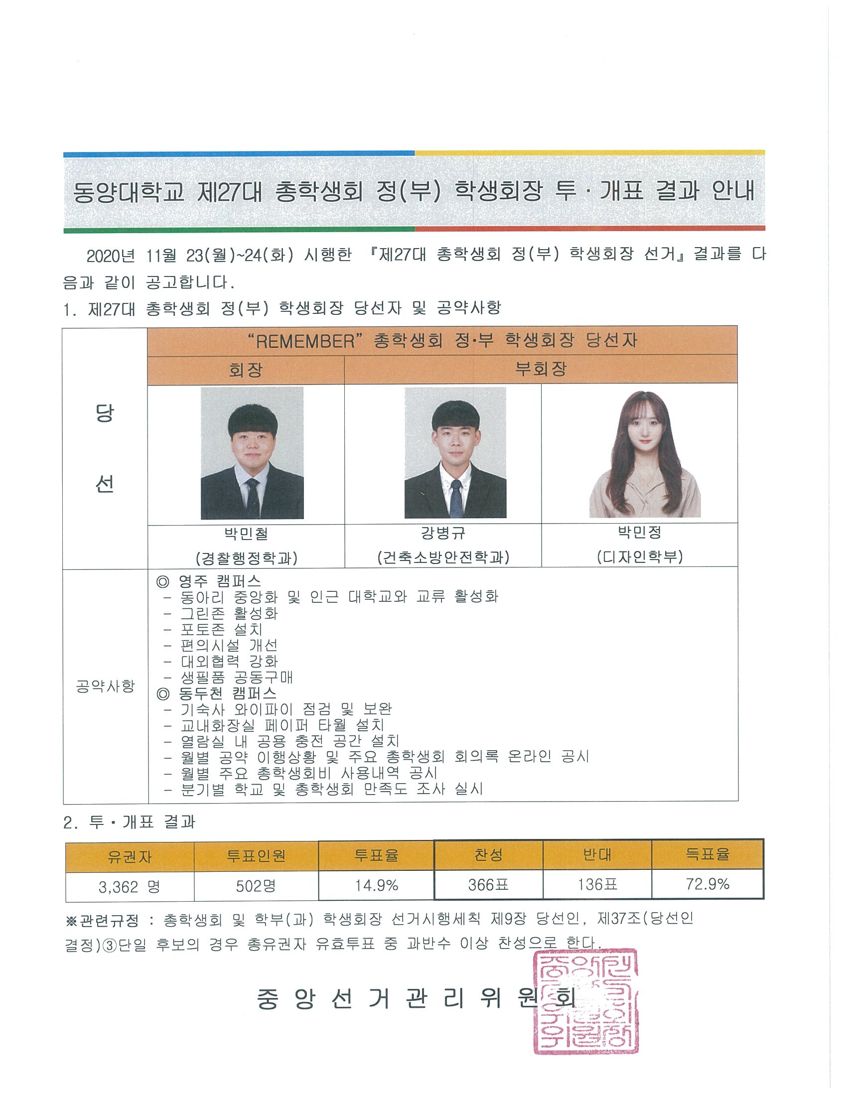 제27대 총학생회 정(부) 학생회장 선출 결과 안내