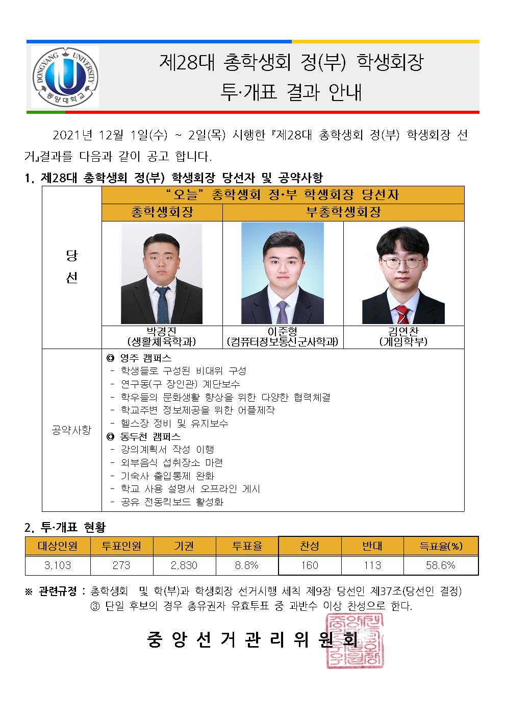 제28대 총학생회 정(부) 학생회장 선출결과 안내