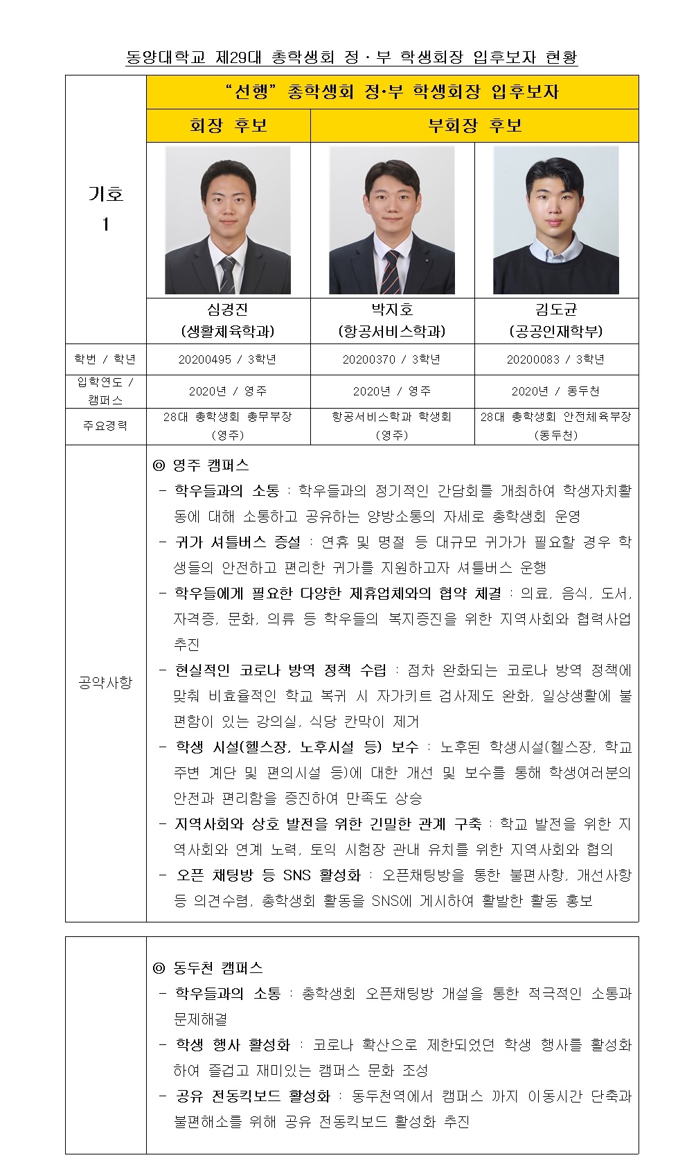 제29대 총학생회 정(부) 학생회장 입후보자 현황 (통합)