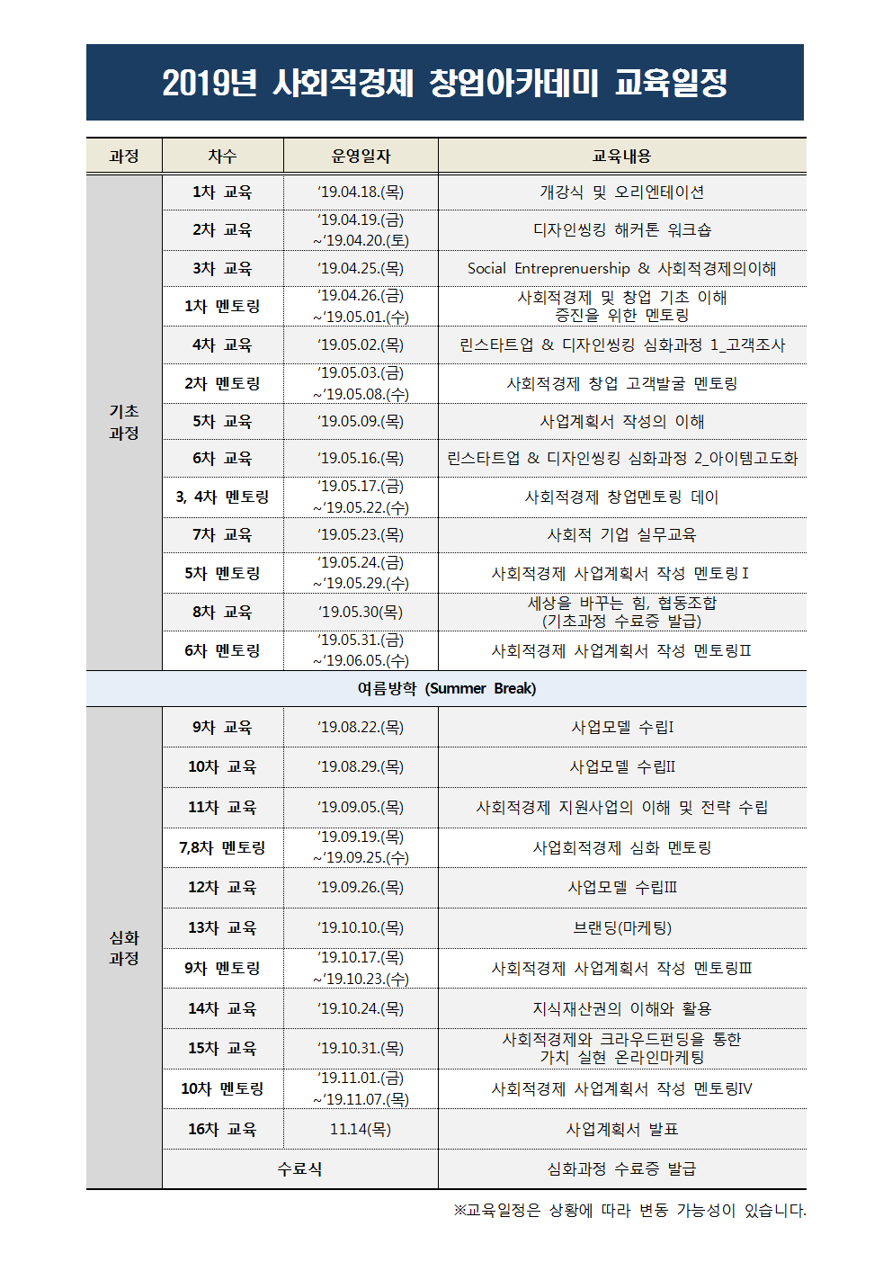 2. (교육일정) 2019년 사회적경제 창업아카데미001