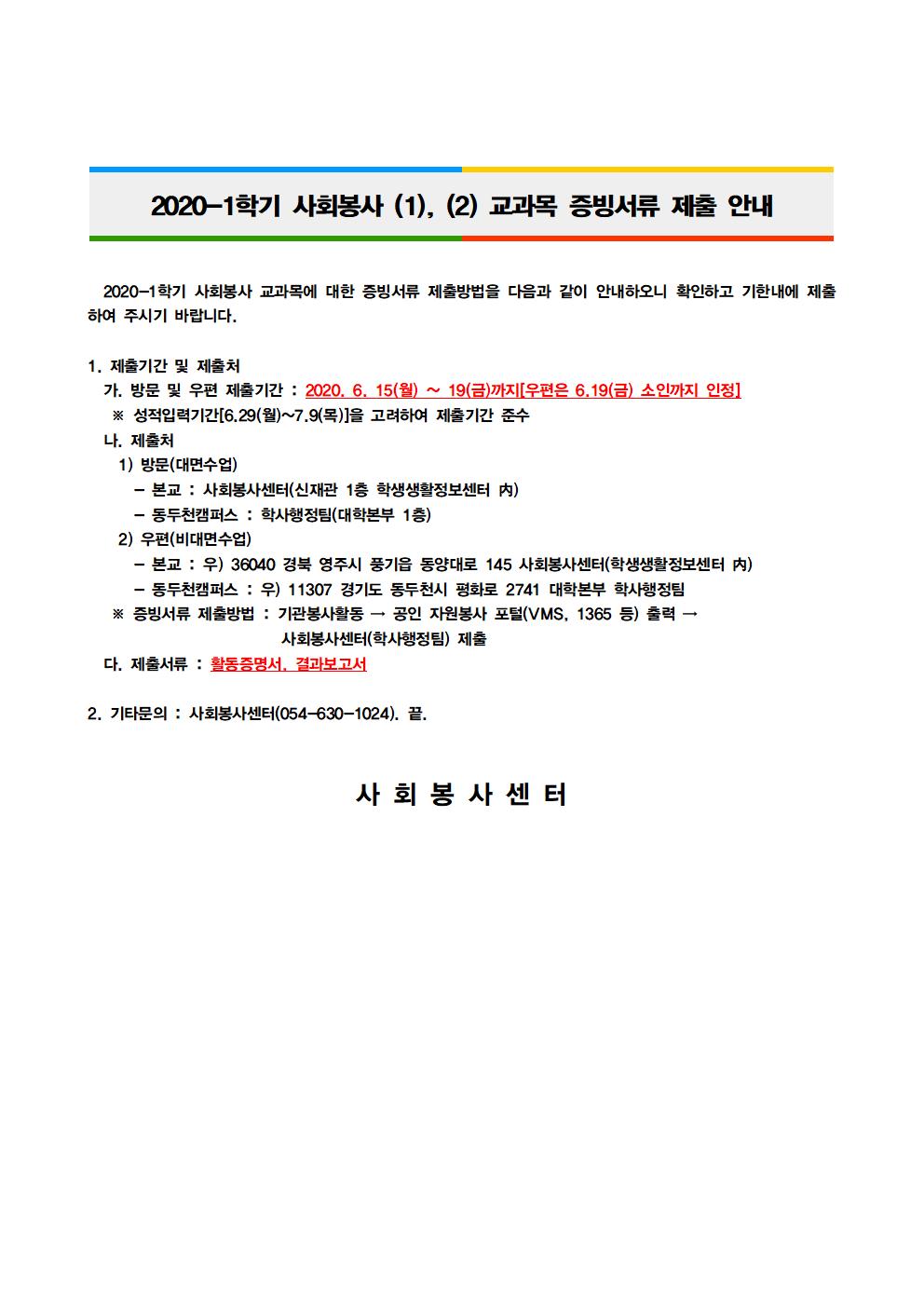 2020-1학기 사회봉사 (1), (2) 교과목 증빙서류 제출 안내