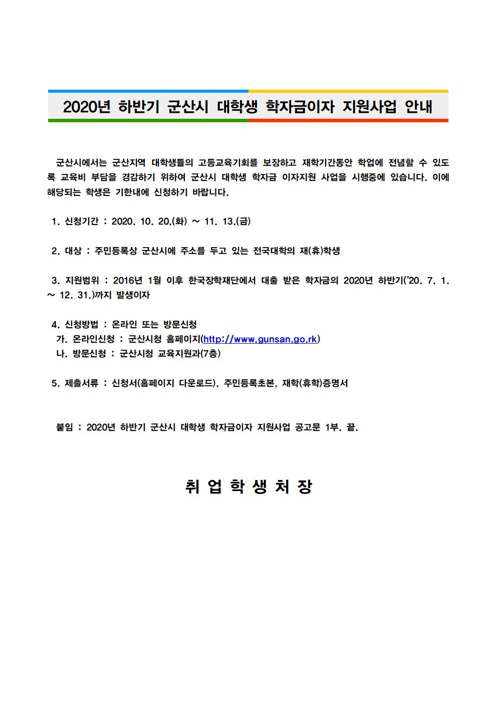 2020년 하반기 군산시 대학생 학자금이자 지원사업 안내