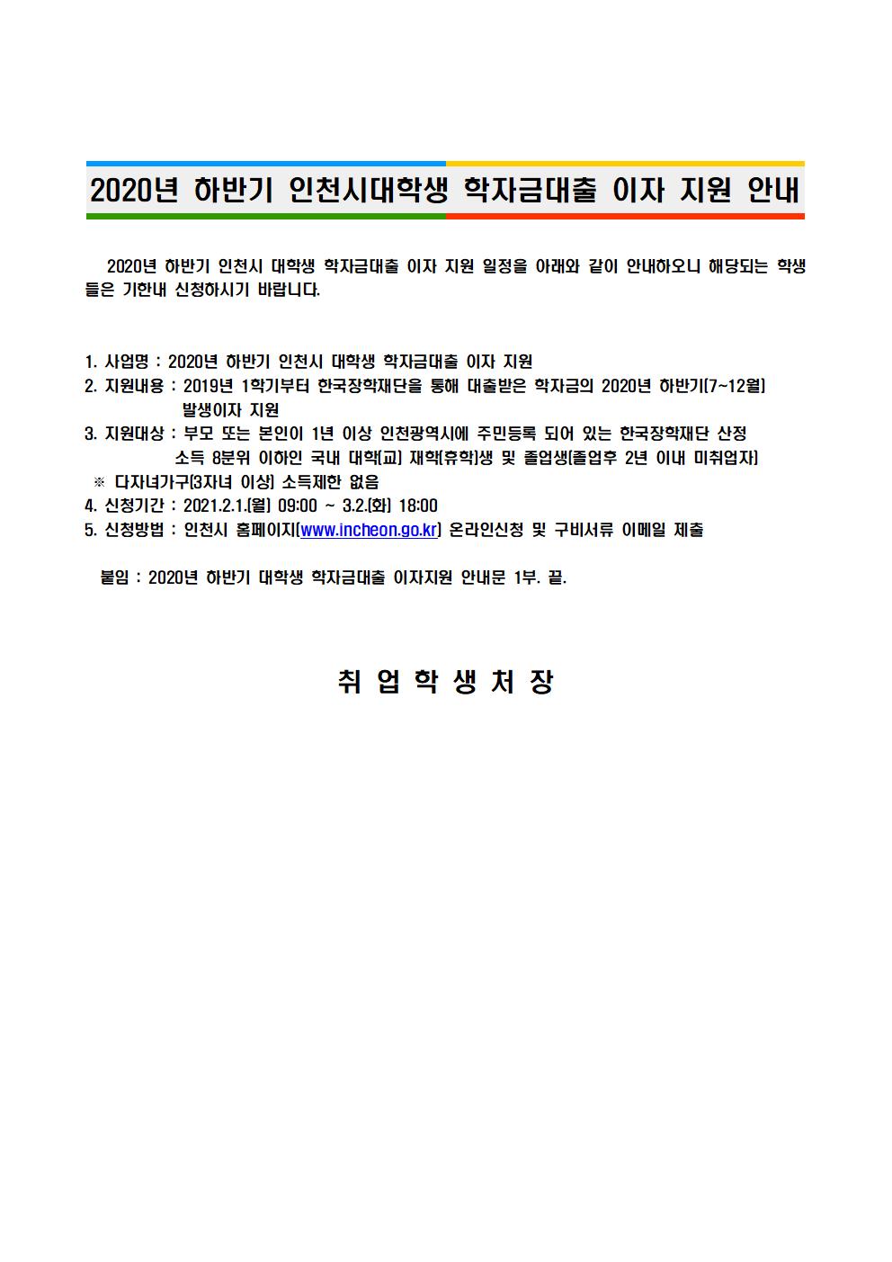 2020년 하반기 인천시 대학생 학자금대출 이자 지원 안내