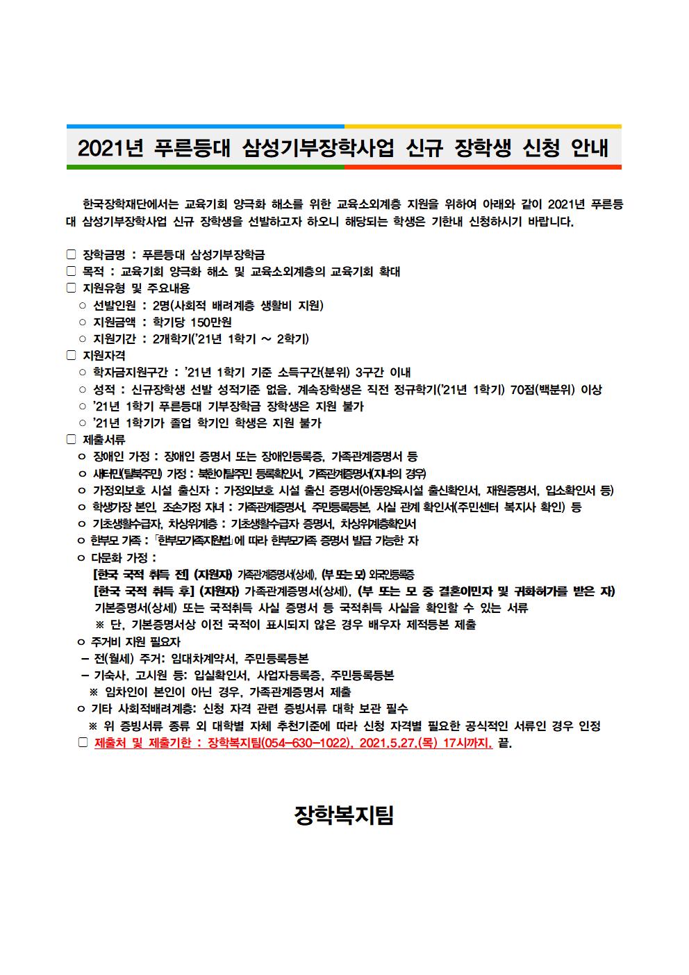 2021년 푸른등대 삼성기부장학사업 신규 장학생 신청 안내001