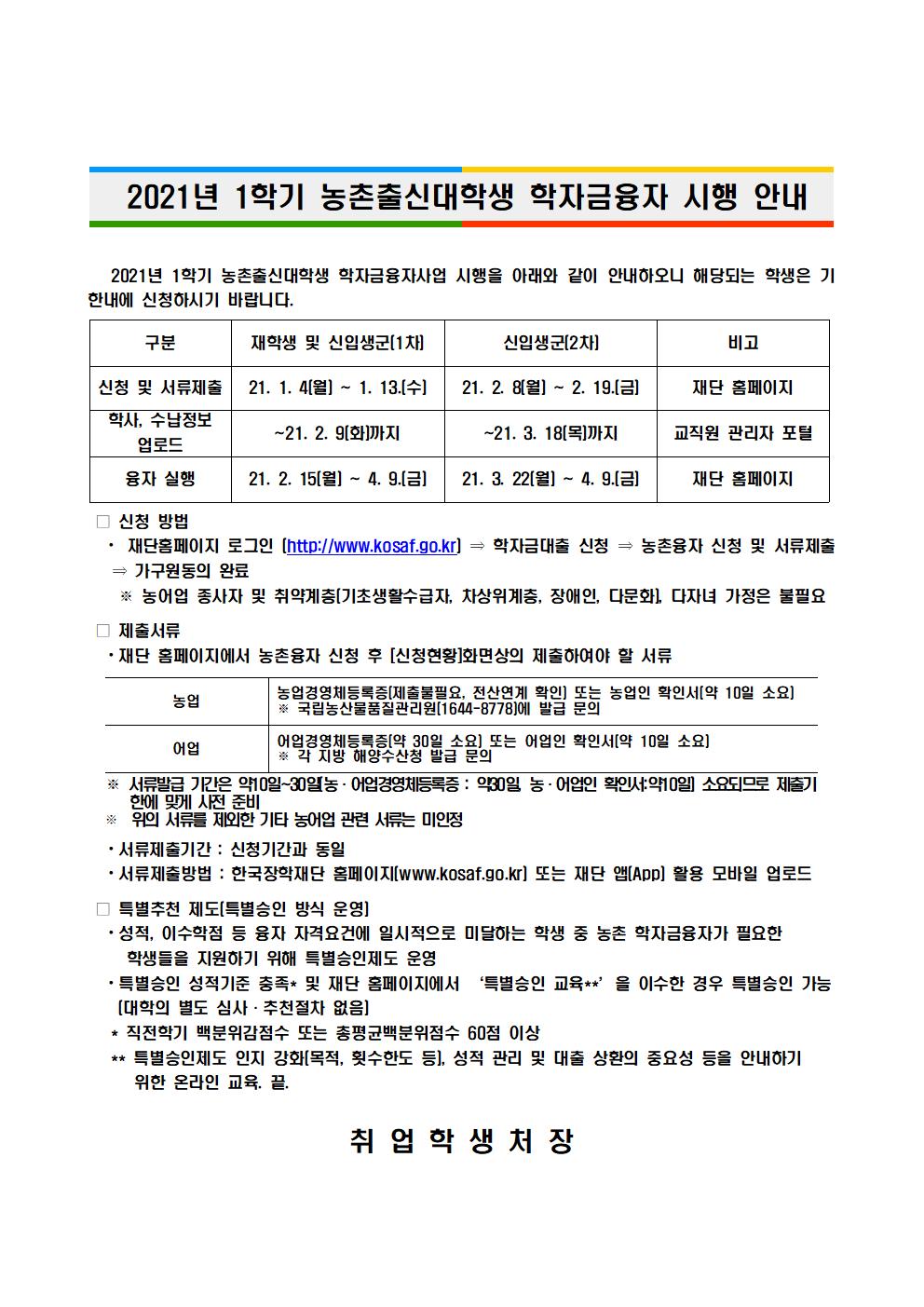 2021년 1학기 농촌출신대학생 학자금융자 시행 안내