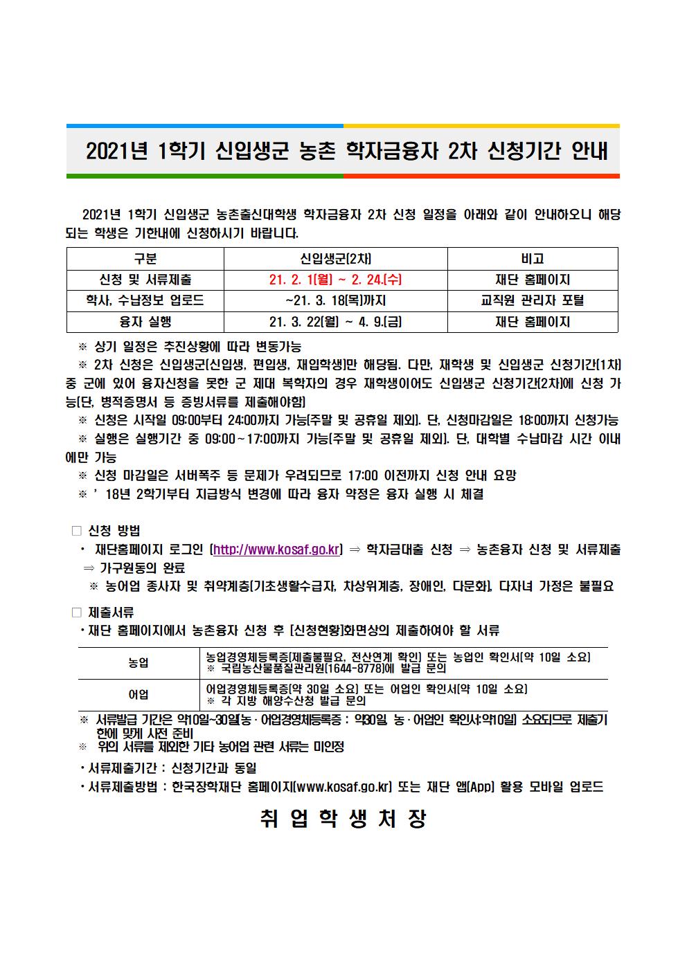 2021년 1학기 신입생군 농촌 학자금융자 2차 신청기간 안내
