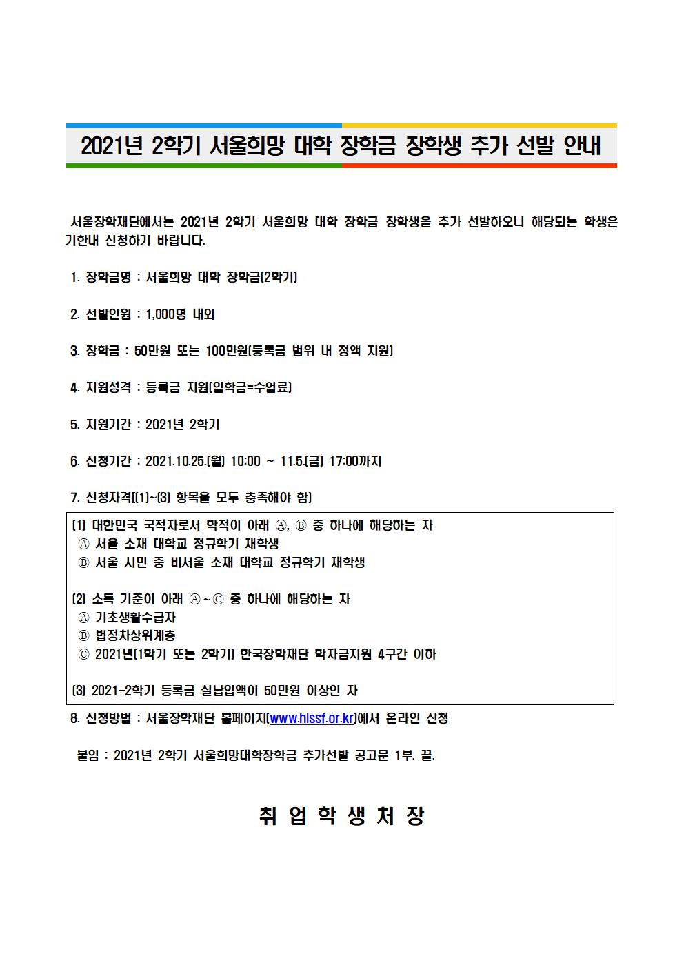 2021년 2학기 서울희망 대학 장학금 장학생 추가 선발 안내