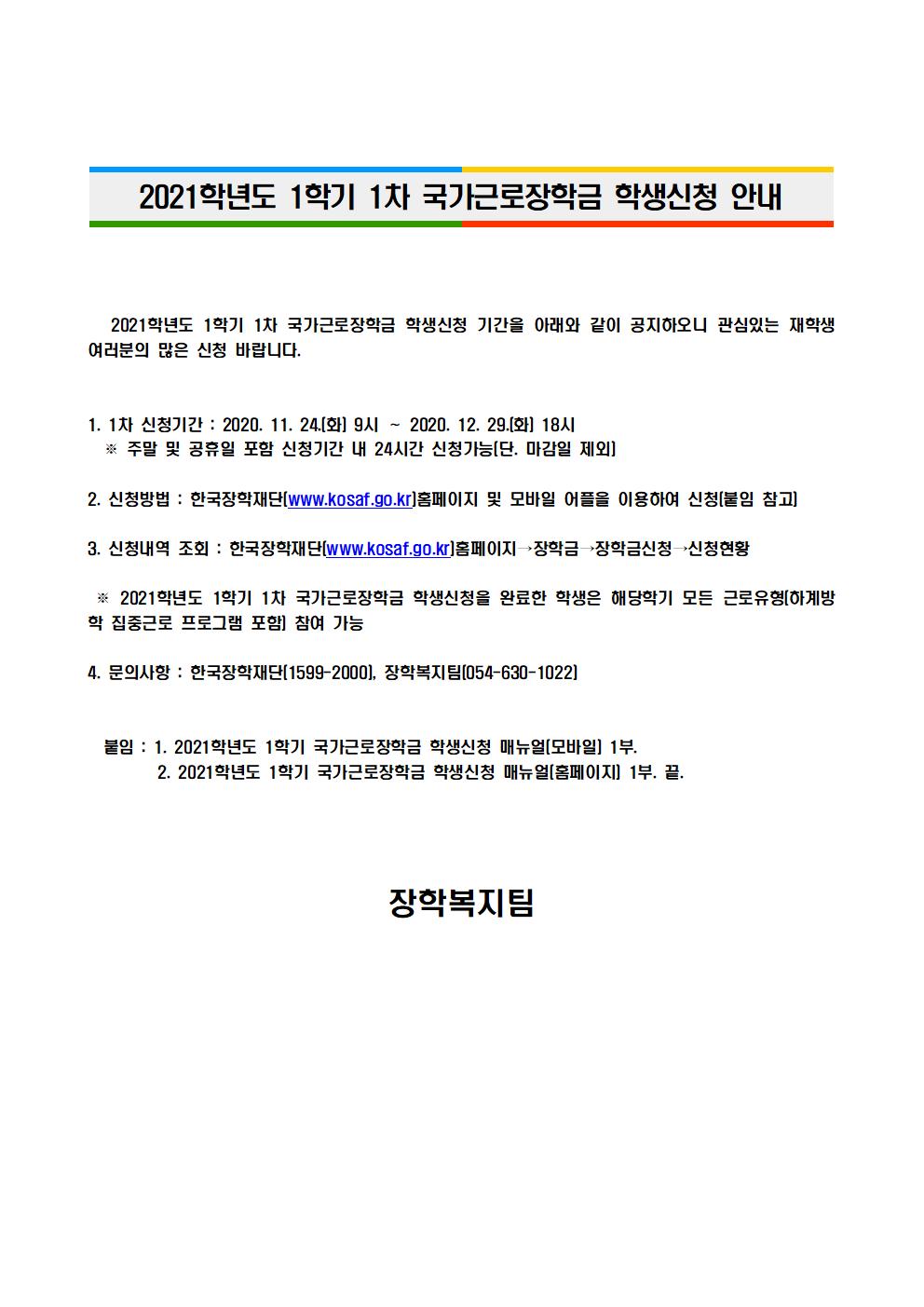 2021학년도 1학기 1차 국가근로장학금 학생신청 안내